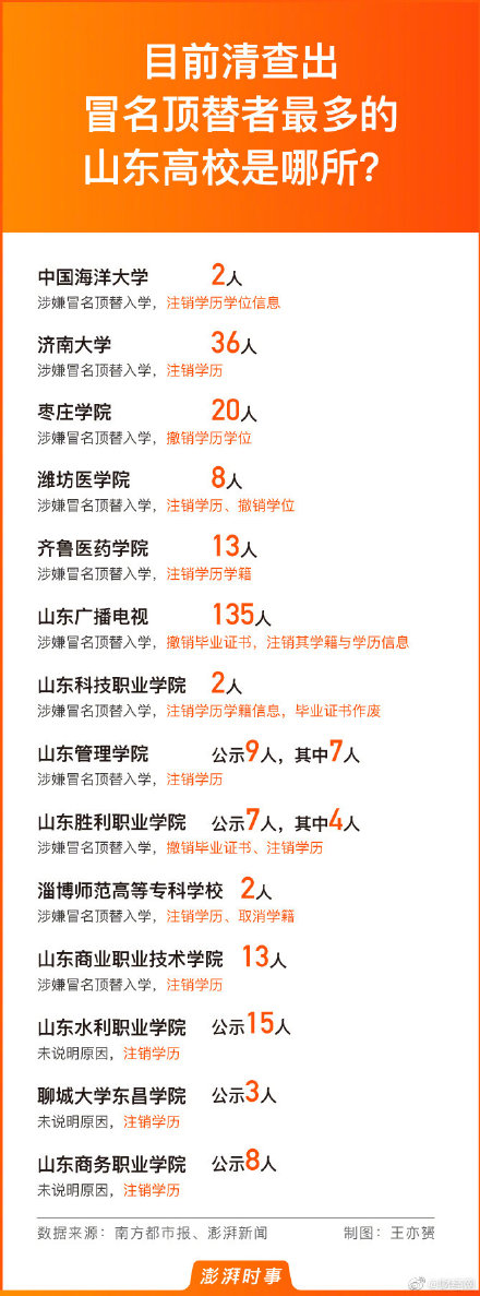 山东曾清查出超两百人冒名顶替取得学历,现已注销,多所高校回应,在2018年-2019年的山东高等学历数据清查工作中,有14所高校曾公示清查结果,其中有242人被发现涉嫌冒名顶替入学取得学历,公示期后学历作注销处理。 ...