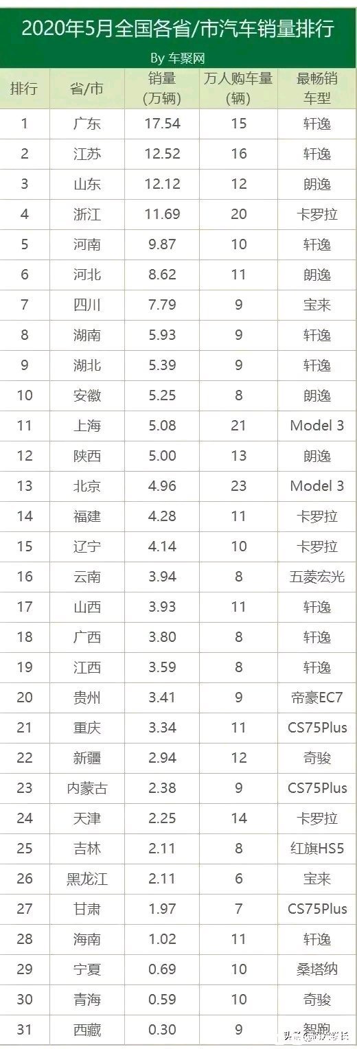 2020年5月全国各省汽车销量排名!河南人最爱买... ...