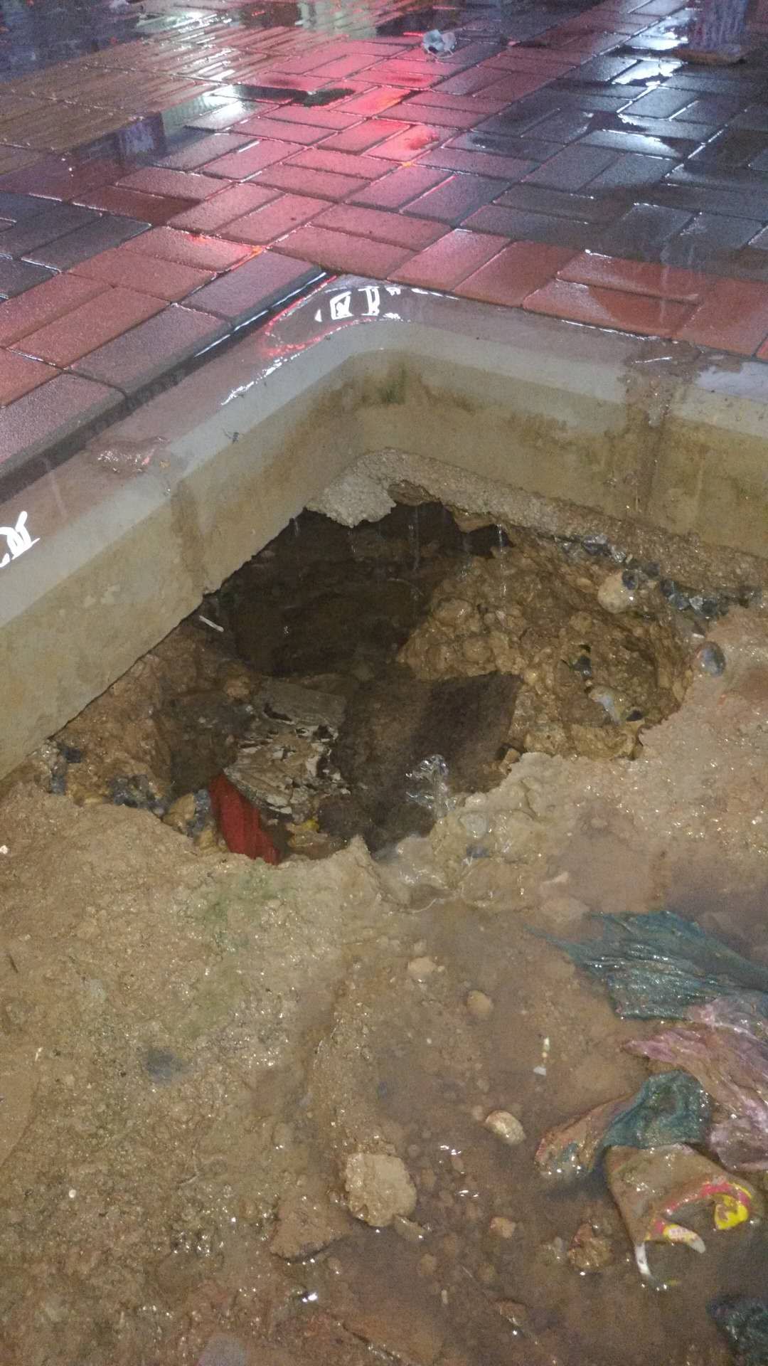 新修的人行道树坑下面是空的,为了避免发生事故建议有关部门处理一下吧。