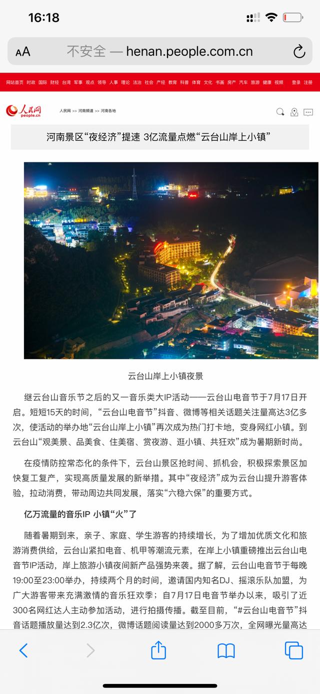 近日,人民网、光明网、中国青年报、映象网等主流媒体,先后以《河南景区“夜经济”提速 3亿流量点燃“云台山岸上小镇”》《云台山电音节引爆民宿小镇夜经济》《亿万流量的云台山电音节 引爆民宿小镇夜经济》等为题 ...