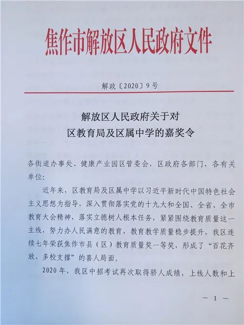 全市中招录取落下帷幕,解放区在全市中招工作中喜获丰收,取得骄人成绩。近日,区政府印发了《解放区人民政府关于对区教育局及区属中学的嘉奖令》,对区教育局及区属各中学在今年中招工作中取得的优异成绩进行通报嘉 ...