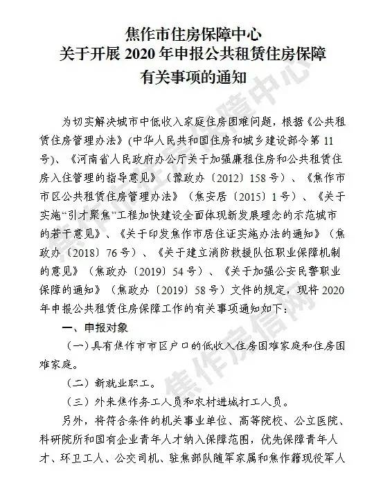2020年申报公共租赁住房保障工作即将开始!申报受理时间:2020年8月24日至2020年9月25日。入户确认时间:2020年8月24日至2020年9月30日。请符合条件的居民前往实际居住地社区进行申请!详见《焦作市住房保障中心关于 ...