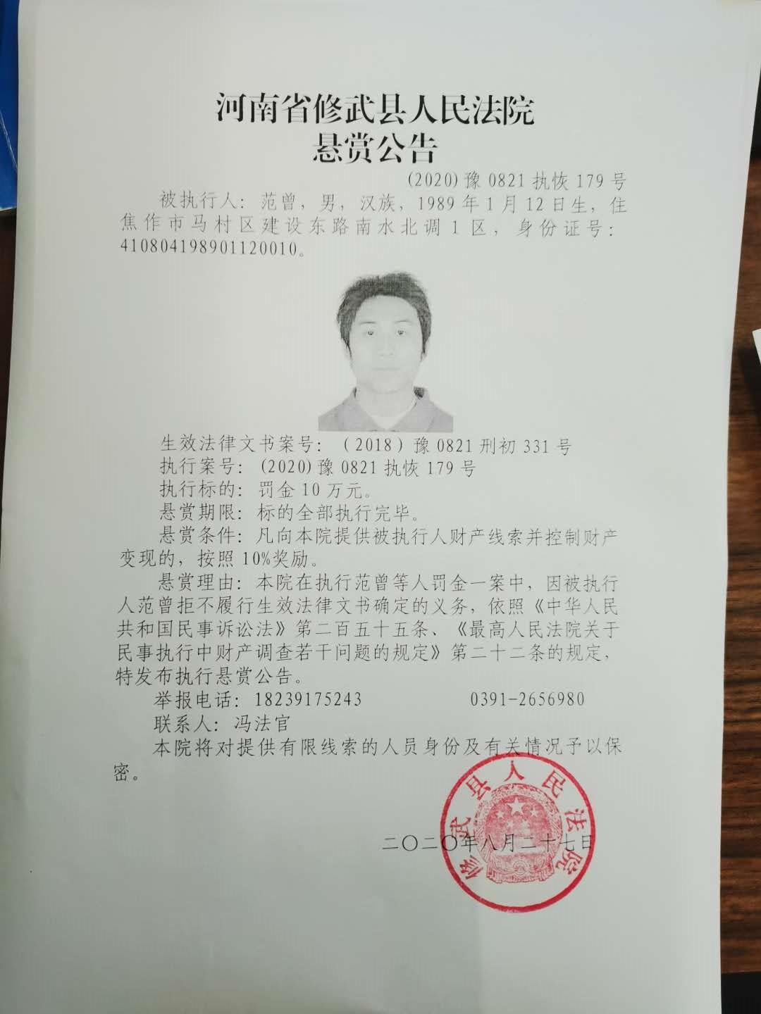 生效法律文书案号:(2018)豫0821刑初331号执行案号:(2020)豫0821执恢179号执行标的:罚金15万元、没收非法所得5500元。悬赏期限:标的全部执行完毕。悬赏条件:凡向本院提供被执行人财产线索并控制财产变现的 ...