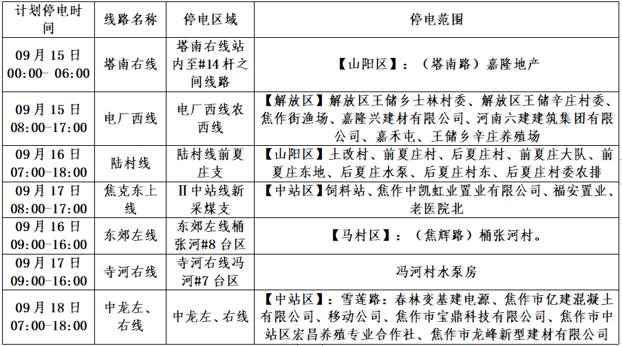 温馨提示电力客户 为了保障焦作电网安全稳定运行、为您提供可靠的电力供应、我们将对焦作电网以下线路进行计划检修、请广大客户及时做好停电准备、提前或延时送电不再另行通知。如遇天气变化,保供电等特殊情况线路 ...