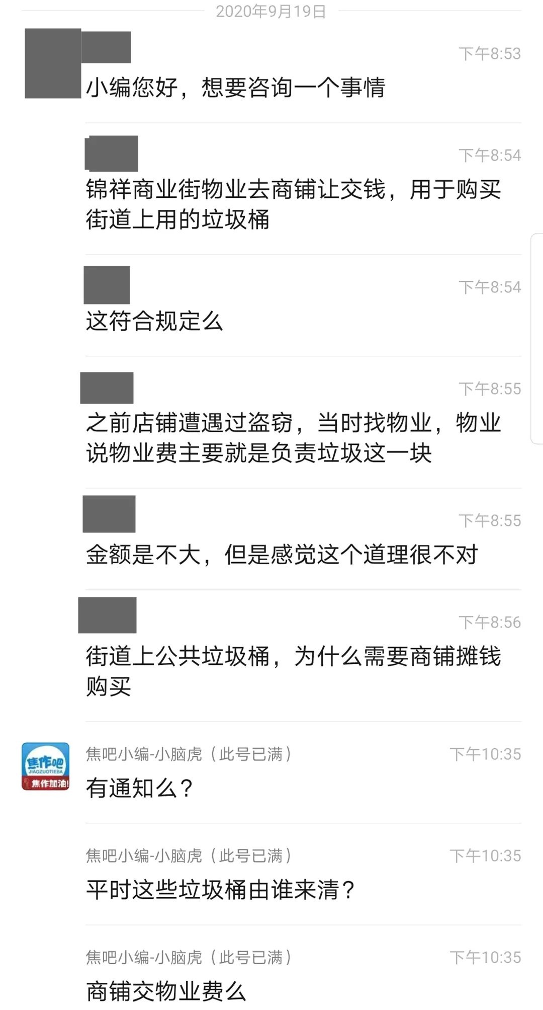 近日,网友爆料,焦作锦祥商业街物业向商铺收费,用于购买街道上的公共垃圾桶,这连个票据都没有,到底该不该交呢.... 物业收过物业费, 又来收取公共垃圾桶的购买费, 这突然来的口头通知, 到底该交还是不该交呢 ...