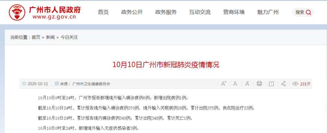 焦作籍一男子确诊境外输入病例! 10月10日广州市新冠肺炎疫情情况 10月10日0时至24时,广州市报告新增境外输入确诊病例6例。新增出院病例1例。 截至10月10日24时,累计报告境外输入确诊病例370例、境外输入 ...