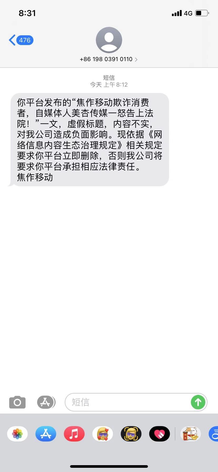 写这篇帖子的时候,致远网络传媒的心是忐忑的。我很担心会不会也收到那条类似的”威胁短信“?会不会被有着强大法务支撑的焦作移动告上法庭? 但是,致远网络传媒作为一名参加过中越战争的老兵,是从死人堆里爬出来的,为了正义、为了老百姓的利益,我不怕来自任何方面的威胁,如果焦作移动公司想找我的事,我一定奉陪到底!!! |