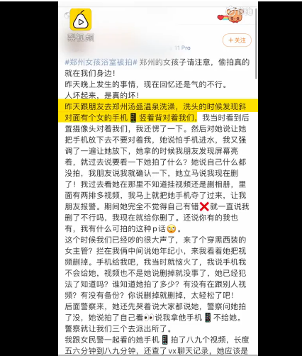 有女网友反映郑州一家温泉洗浴时,遭一名女子拿手机在背后偷拍。翻看其手机发现很多视频片段,疑似惯犯。据郑州警方介绍,先期以侵犯公民个人隐私对该女子予以行政拘留10日,并处罚款500元。拘留期间继续对其涉嫌违 ...