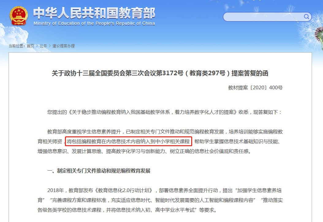 12月9日,教育部官网公布了《关于政协十三届全国委员会第三次会议第3172号(教育类297号)提案答复的函》 针对全国政协委员提出的《关于稳步推动编程教育纳入我国基础教学体系,着力培养数字化人才的提案》 ...