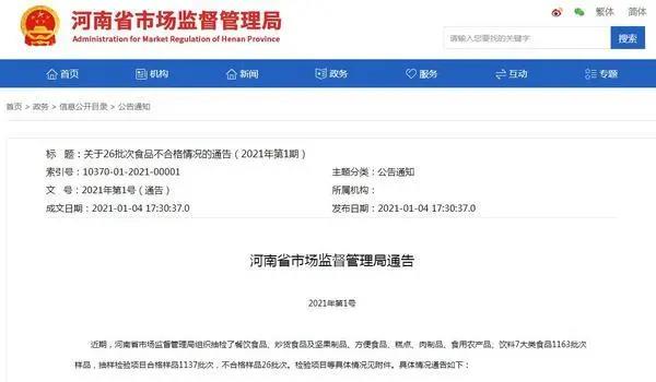 1月4日,2021年上班的第一天,河南省市场监督管理局发布了“2021年第1号”食品抽检通告,此次抽检涉及到餐饮食品、炒货食品、食用农产品及饮料7大类食品1163批次样品,抽样检验项目合格样品1137批次,不合格样品26批 ...