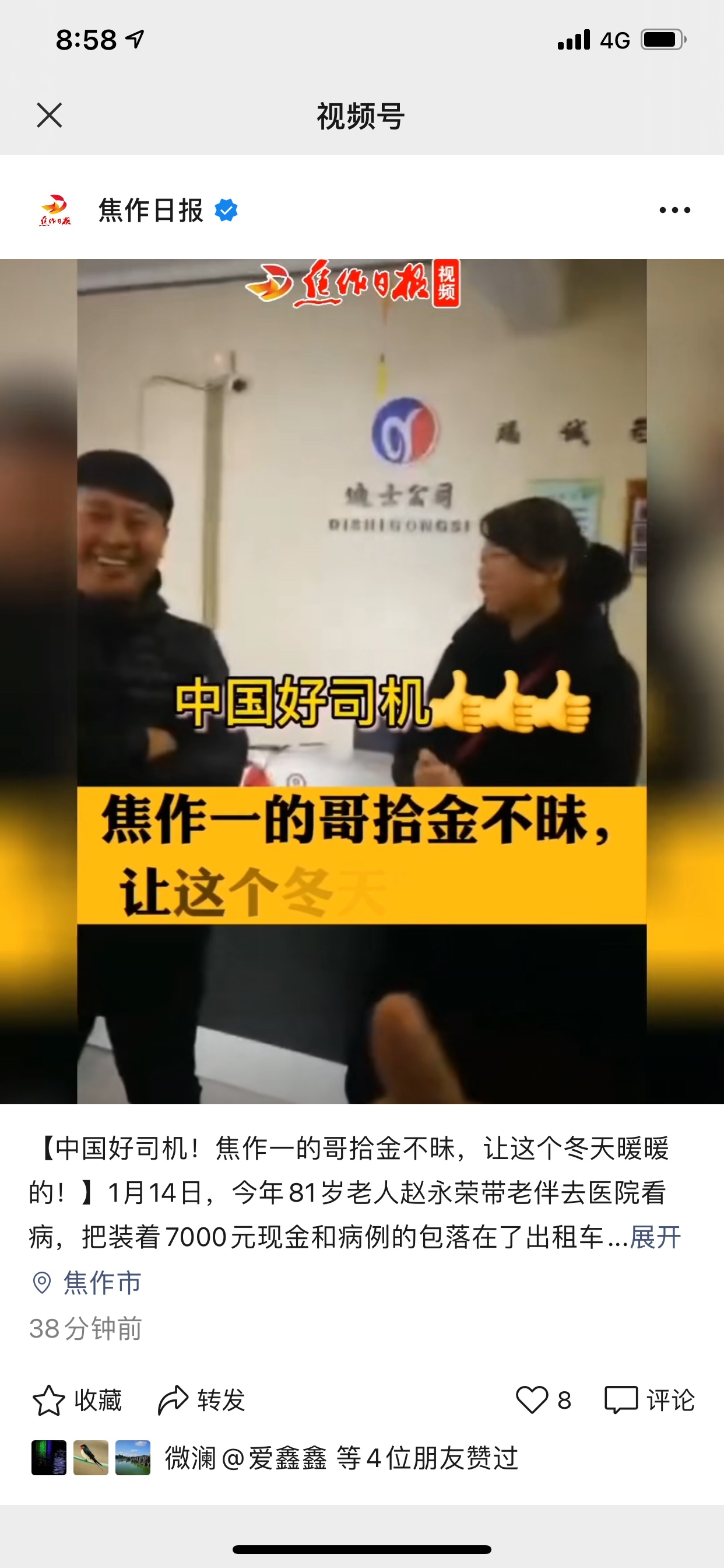 【中国好司机——焦作迪士出租车公司的哥拾金不昧,让这个冬天暖暖的!】2021年1月14日,今年81岁老人赵永荣带老伴去医院看病,把装着7000元现金和病历的包落在了迪士出租车公司的一辆出租车上。老人到医院发现钱不 ...