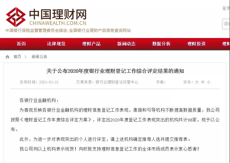 中国银行业理财登记托管中心日前发布《关于公布2020年度银行业理财登记工作综合评定结果的通知》。