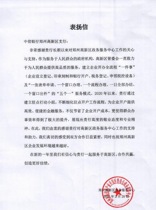 2021年3月10日,郑州市高新区政务服务中心向中信银行郑州高新区支行送来表扬信,高度赞扬该行一年来为高新区政务服务工作提供的支持、作出的贡献。 中信银行郑 ...