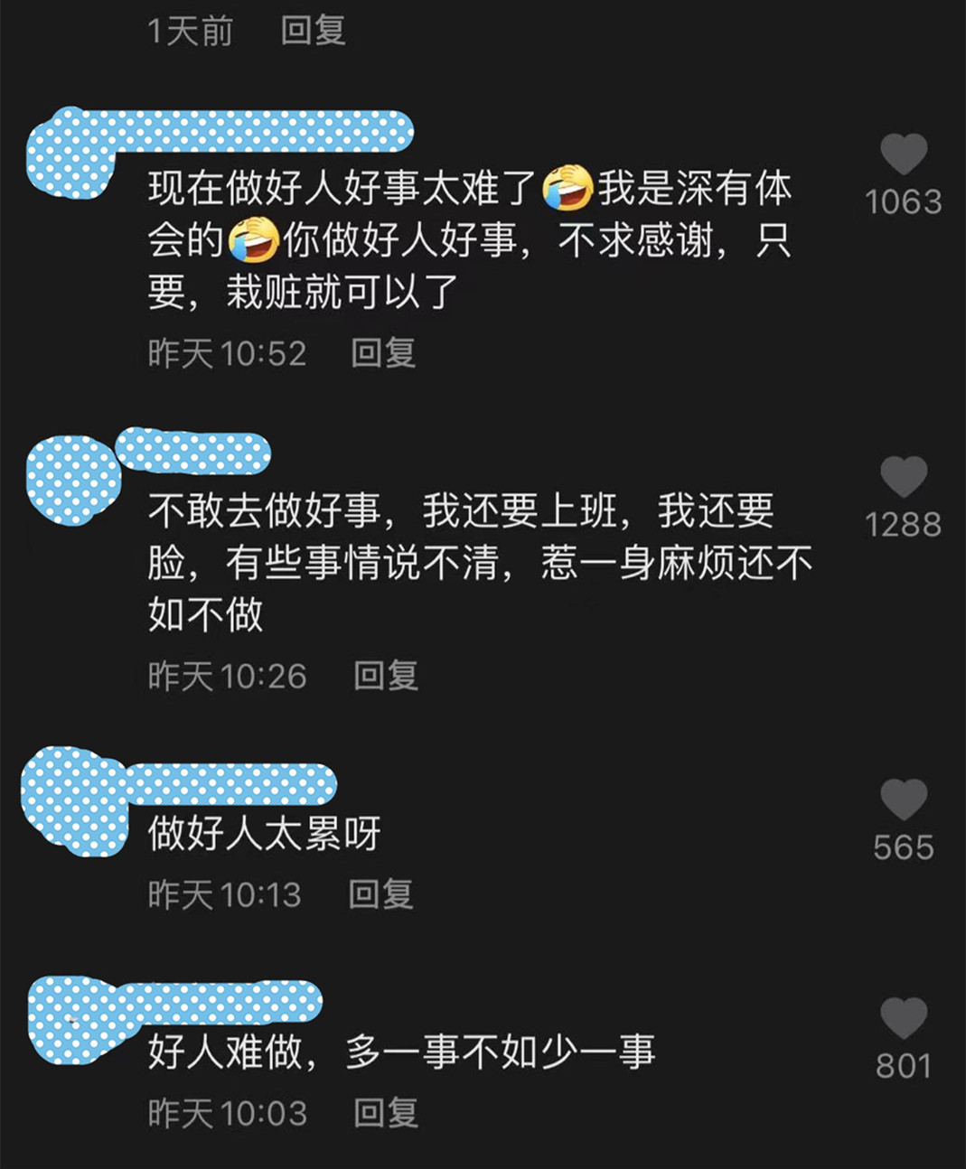 | 只能说当今的社会,好人不好做,但好人还是多数的,需要人们之间坦诚相待,多些信任,少些猜忌,不要让做好事的人寒了心 |