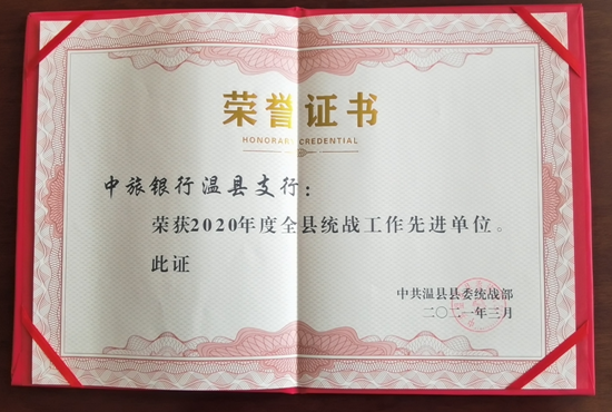 焦作中旅银行温县支行荣获“2020年度全县统战工作先进单位”称号 近日,中共温县县委统战部对2020年度全县统战工作先进单位和先进个人进行了表彰。焦作中旅银行温县支行荣获“2020年度全县统战工作先进集体”称号。 ...