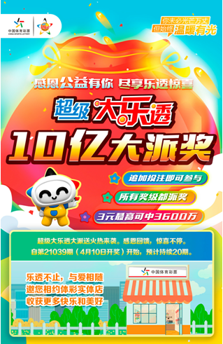 4月好运正开启,追加投注更惊喜。正值中国体育彩票全国统一发行27周年,为感恩回馈广大购彩者多年的喜爱和支持,以及为公益事业做出的贡献,超级大乐透火热开启10亿大派奖活动!活动将于第21039期(4月10日开奖) ...