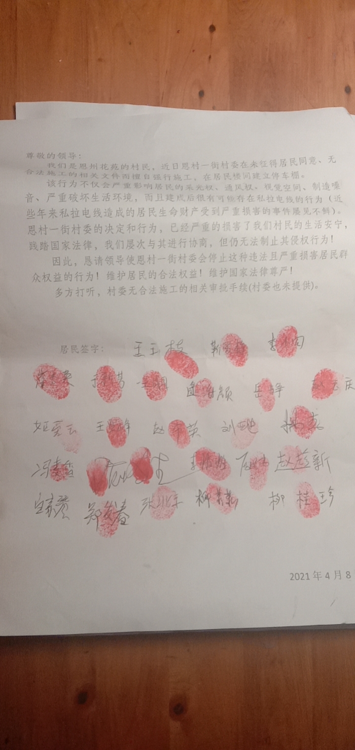我们是焦作市山阳区新城办事处恩州花苑的居民,恩村一街村委忽然在楼房楼梯口张贴要在两楼之间绿化带上建电动三轮车停车棚(含充电),联系副村长,说该行为不仅会严重影响居民的采光权、 ...