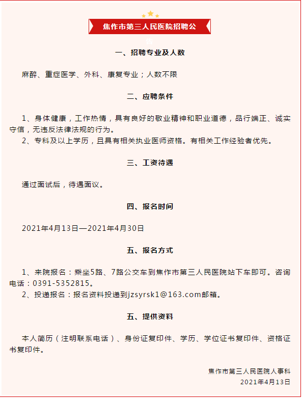 焦作市第三人民医院公开招聘!人数不限、专科可报……