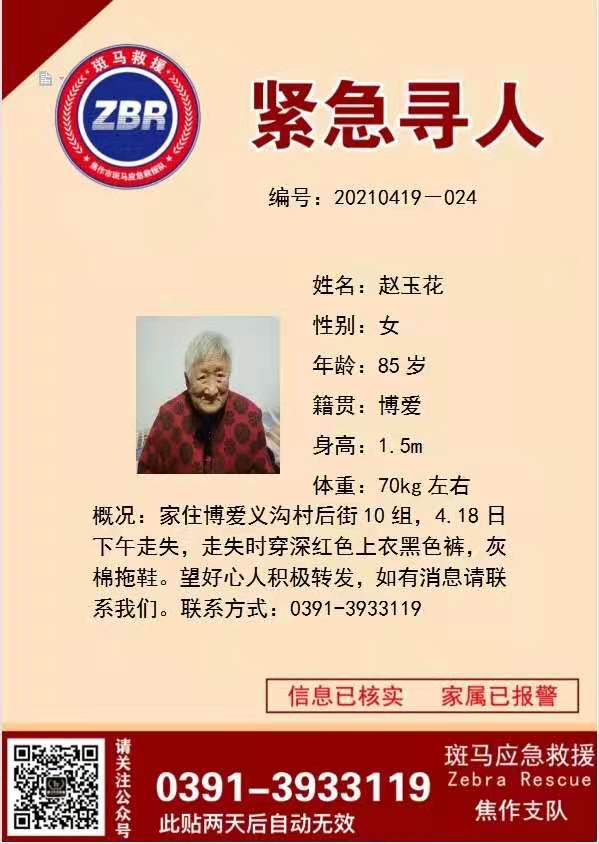 紧急寻人!焦作八旬老太走失两天,家人急寻!请各位好心人接力转发!