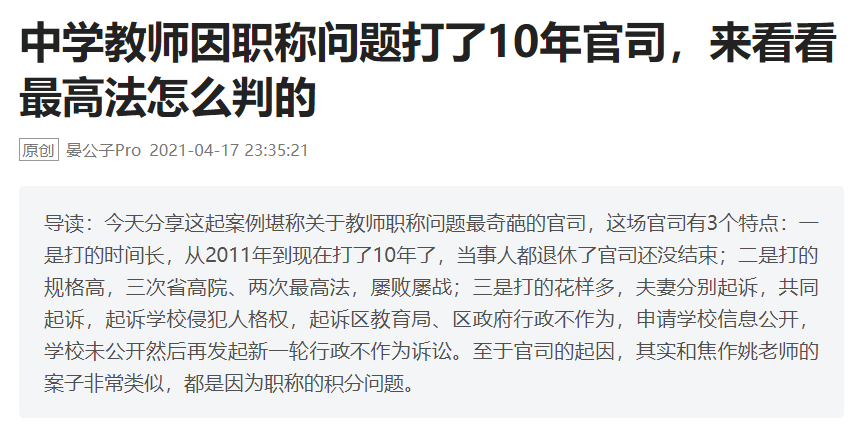 导读:今天分享这起案例堪称关于教师职称问题最奇葩的官司,这场官司有3个特点:一是打的时间长,从2011年到现在打了10年了,当事人都退休了官司还没结束;二是打的规格高,三次省高院、两次最高法,屡败屡战;三是 ...