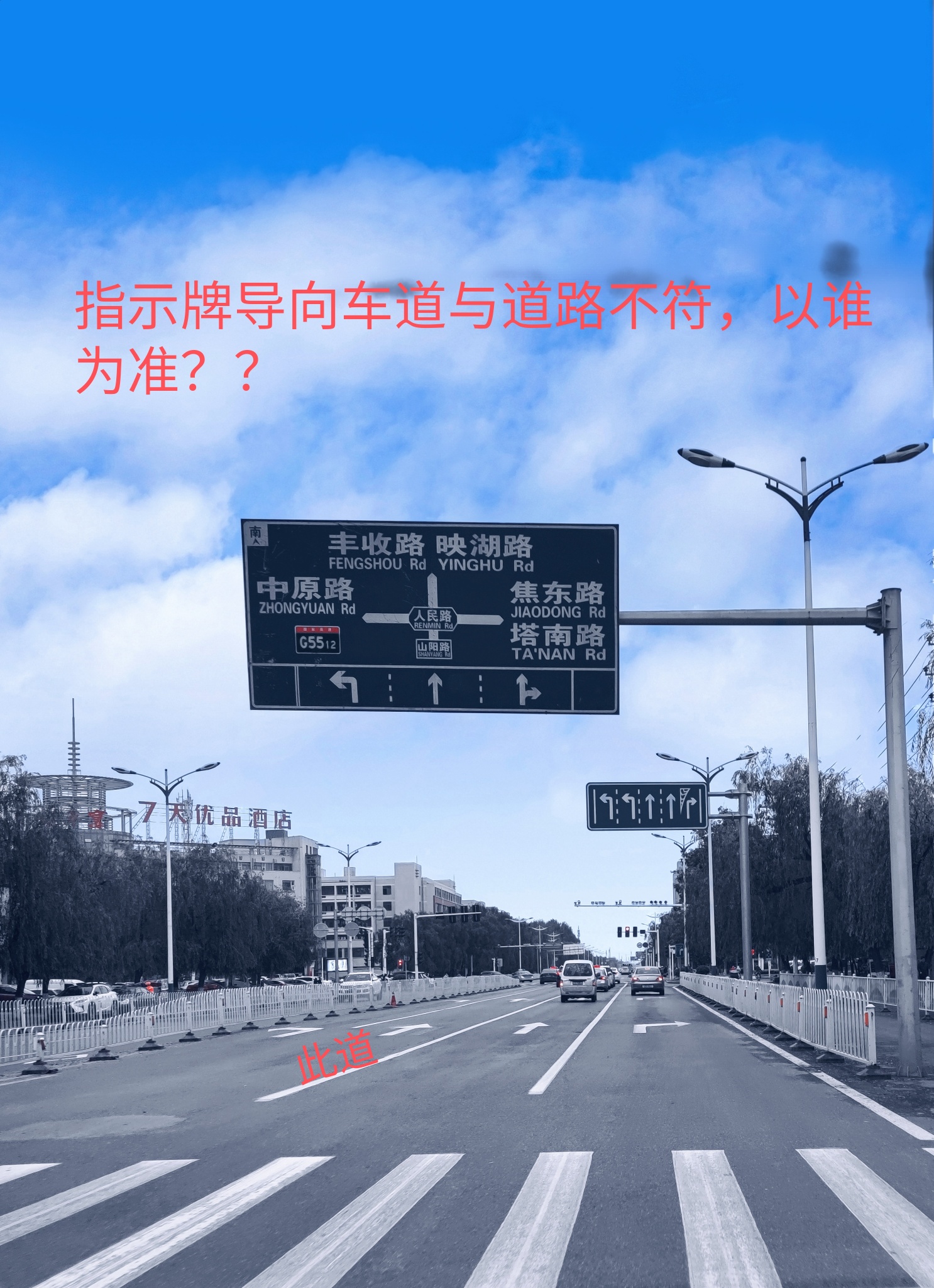位于人民路与山阳路的交汇处,由北向南向行驶,交通标识牌上标的是,左转弯,路面上标识的是直行,越过停车线以后,发现是左转弯待转,不知道是哪个大师设计的道路,这种标识会严重的影响 ...