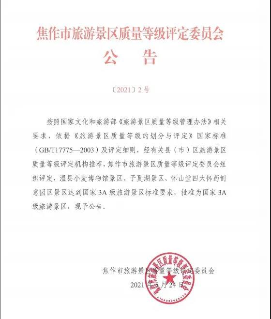 我市新增3家AAA级旅游景区,目前A级以上旅游景区总数达41个 5月24日,市旅游景区质量等级评定委员会发布公告,批准温县小麦博物馆景区、子夏湖景区、怀山堂四大怀药创意园区景区为国家AAA级旅游景区。目前,我市A级 ...