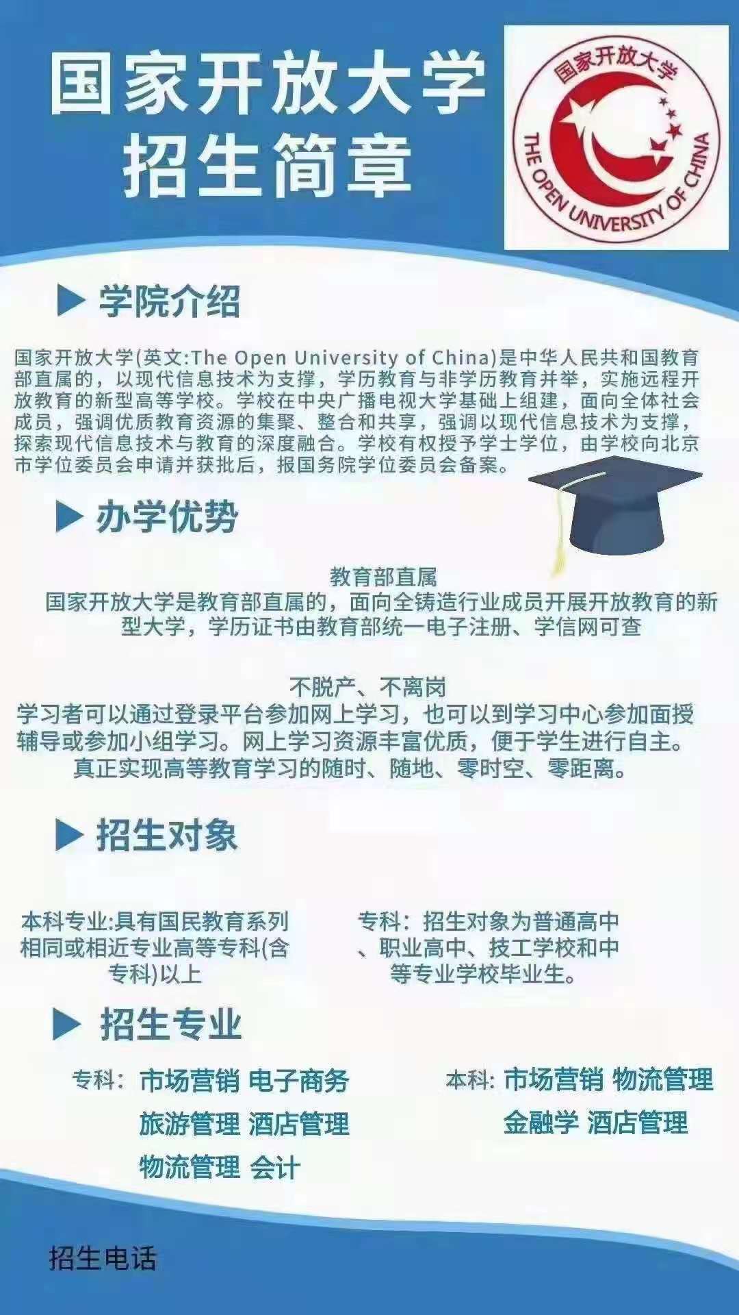 国家开放大学 21秋端口已开,专业如下: 旅游管理,酒店管理,物流管理,市场营销,电子商务,会计 名额有限,报满为止,学习形式灵活,欢迎报考! 咨询电话:19939178924 ...