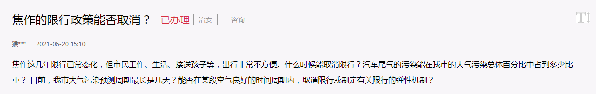 根据领导留言板消息:焦作的限行政策能否取消问题,官方对此正式回复。 网友留言: 人民网网友您好,收到您的留言后,我们立即转交焦作市生态环境局处理,现将处理结果回复如下: 根据 ...