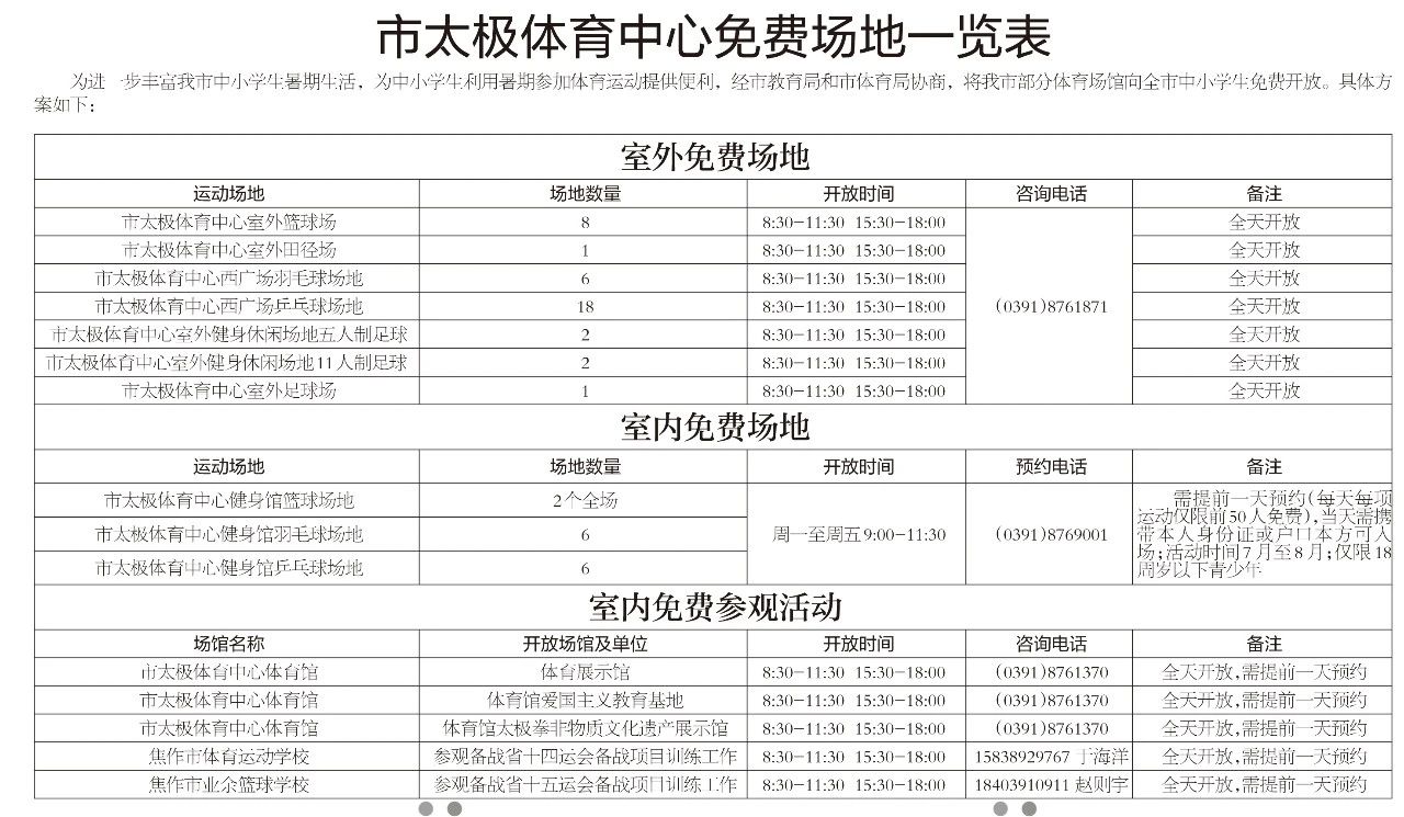 焦作太极体育中心免费场地开放信息公布! 为进一步丰富我市中小学生暑期生活 为中小学生利用暑期参加体育运动提供便利 经市教育局和市体育局协商 将我市部分体育场馆 向全市中小学生免费开放 具体方案如下 免 ...