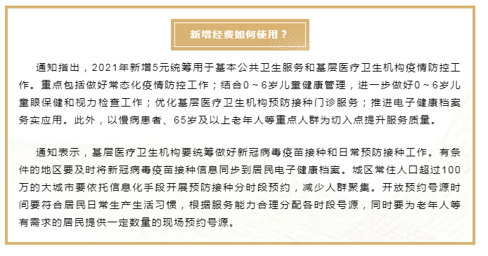 这项补贴涨了! 好消息2021年人均基本公共卫生服务经费补助标准为79元比上年新增5元 国家卫健委日前发出通知要求做好2021年基本公共卫生服务项目工作 来源:国家卫健委 ...