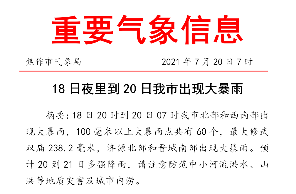 18日20时~20日05时晋城市总雨量图(单位:毫米) 二、天气预报 1、焦作天气预报预计20日到21日强降雨持续,22日降雨减弱,全市天气预报:20日:阴天有大到暴雨,局部大暴雨,偏东风4级,22~26℃21日:阴天有大到 ...