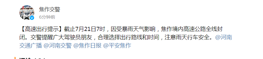 紧急扩散!焦作境内高速公路全线封闭!! 截至7月21日7时因受暴雨天气影响焦作境内高速公路全线封闭交警提醒广大驾驶员朋友合理选择出行路线和时间注意雨天行车安全 ...