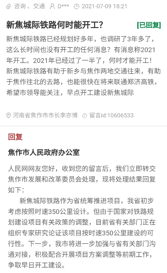 | 支持焦作高铁尽快向东联通新乡京广铁路,向西联通洛阳陇海铁路 |