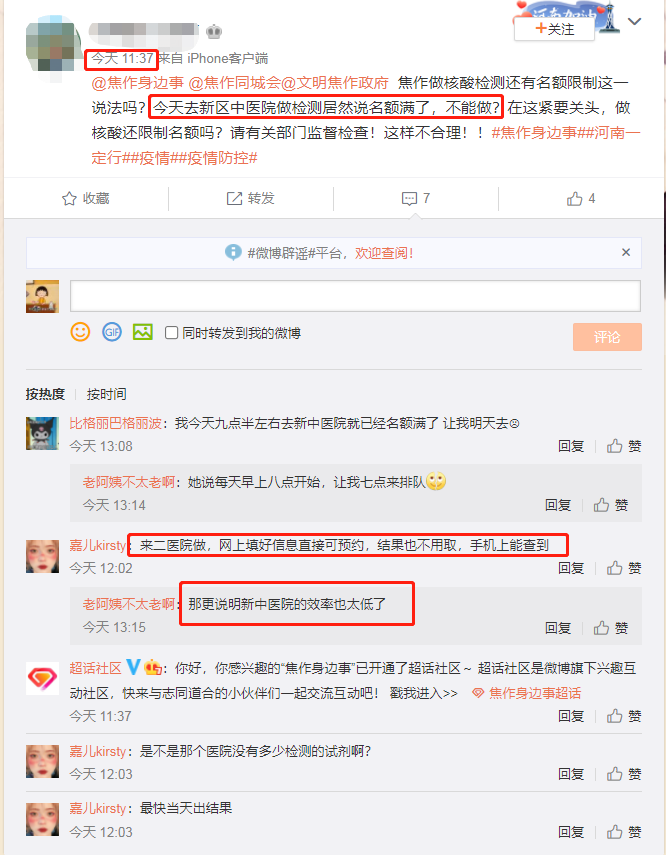 今日,有焦作市民在网上发帖,在新区中医院做核酸检测被告知名额满了不能做。对此现象网友表示不解,疫情防控都到紧要关头了做核酸检测还限制名额吗? 如今焦作疫情防控形势较为严峻,据网友反映上述核酸检测点普遍 ...