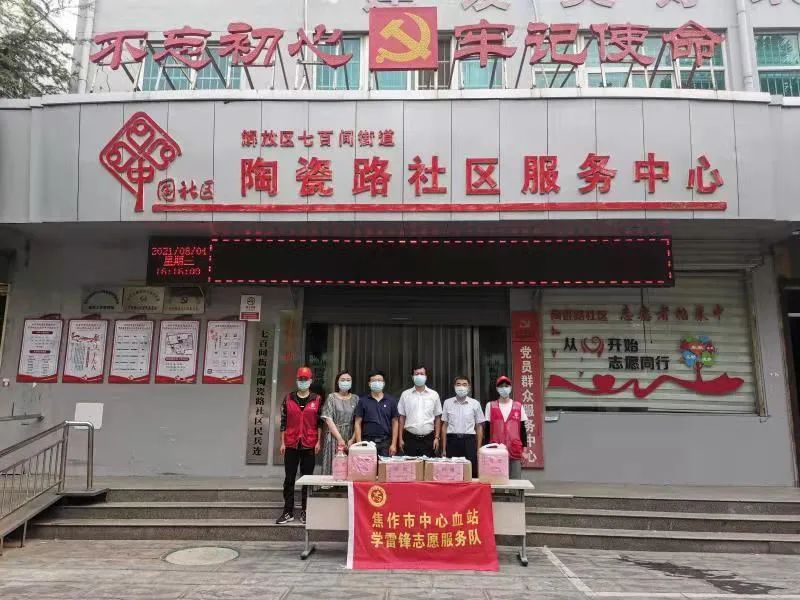 8月4日下午,焦作市中心血站党支部书记李君超、工会主席王祖江带领学雷锋志愿服务队成员们,来到解放区七百间街道陶瓷路社区服务中心为帮扶社区捐赠口罩、酒精及84消毒液等防疫重要物资,为奋战在一线的社区工作者们 ...