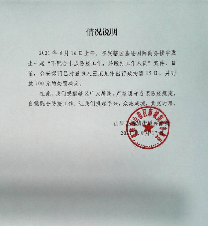 【情况说明】 2021年8月16日上午,在我辖区嘉隆国际商务楼宇发生一起“不配合卡点防疫工作,并殴打工作人员”案件。目前,公安部门已对当事人王某某作出行政拘留15日,并罚款700元的处罚决定。 在此,我们提醒辖区 ...
