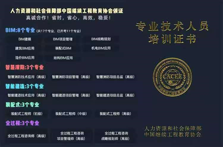 人社BIM、装配式工程师、智慧消防、智能建造、全过程… 部委直属,中铁、中建推荐! 继续教育学时重要依据 线上考试、省心模式,项目稳妥,证书权威! 2021年9月11日考核批次报名已开启!! 电话:19939178924 ...