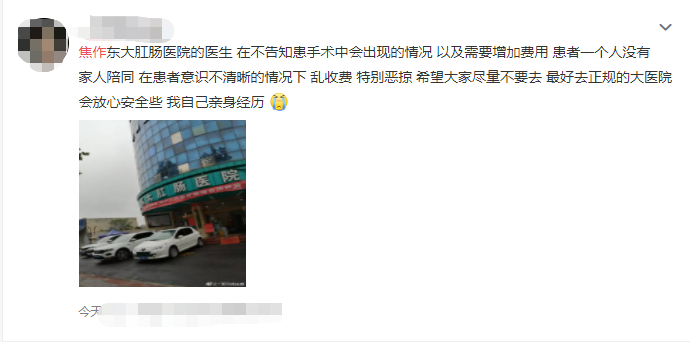 今日,有网友分享了自己在焦作市东大肛肠医院的就诊经历。网友表示,在手术前医生并未主动告知自己手术风险以及提醒自己需要增加费用的事;在手术过程中,在自己意识不清楚的情况下医院方乱收费。希望通过自己的亲身 ...