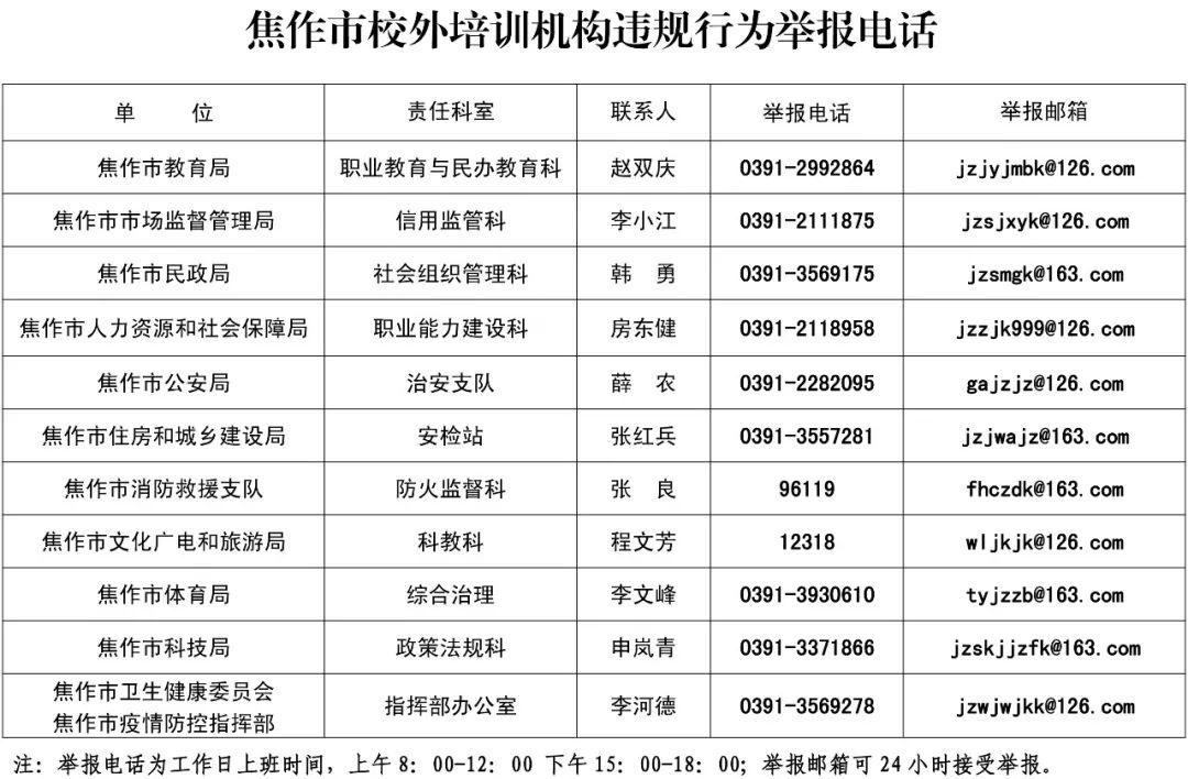 关于公布焦作市校外培训机构违规行为举报电话的公告 根据中共中央办公厅、国务院办公厅《关于进一步减轻义务教育阶段学生作业负担和校外培训负担的意见》和《河南省基础教育校外培训机构专项整治实施方案》以及 ...