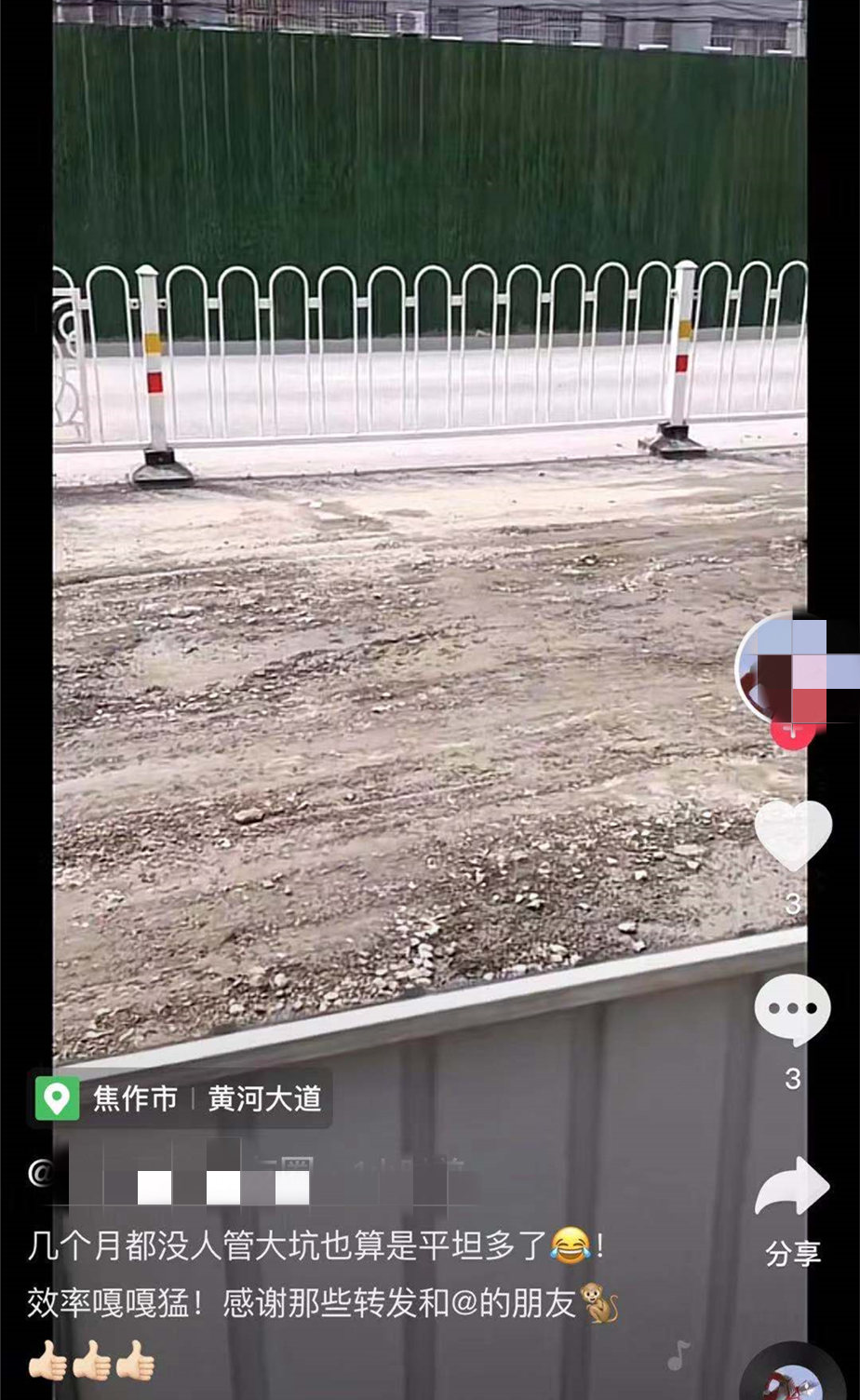 昨日,咱们焦作武陟县城的一条路火了,原因是因为一个视频!视频中因为路面积水导致过往车辆看不到路面大坑,经过此处的三轮车无一幸免,都被大坑卡住,甚至还出现了翻车、手机掉落到水坑的情况。 今天,发布这条视 ...