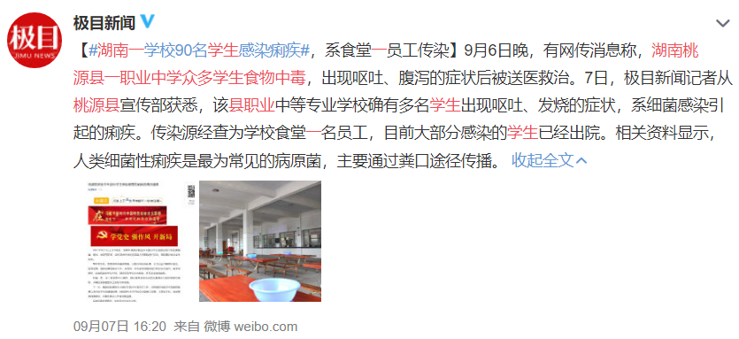 本帖最后由 柠檬的向日葵 于 2021-9-14 16:37 编辑 9月6日晚,有网传消息称,湖南桃源县一职业中学众多学生食物中毒,出现呕吐、腹泻的症状后被送医救治。 2021年9月1日上午9时起,常德市桃源县职业中专部分学生 ...