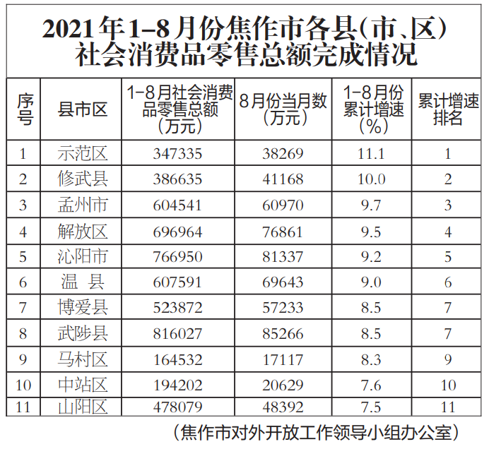 速看!1至8月份焦作各县(市)区社会消费品零售额完成情 ...