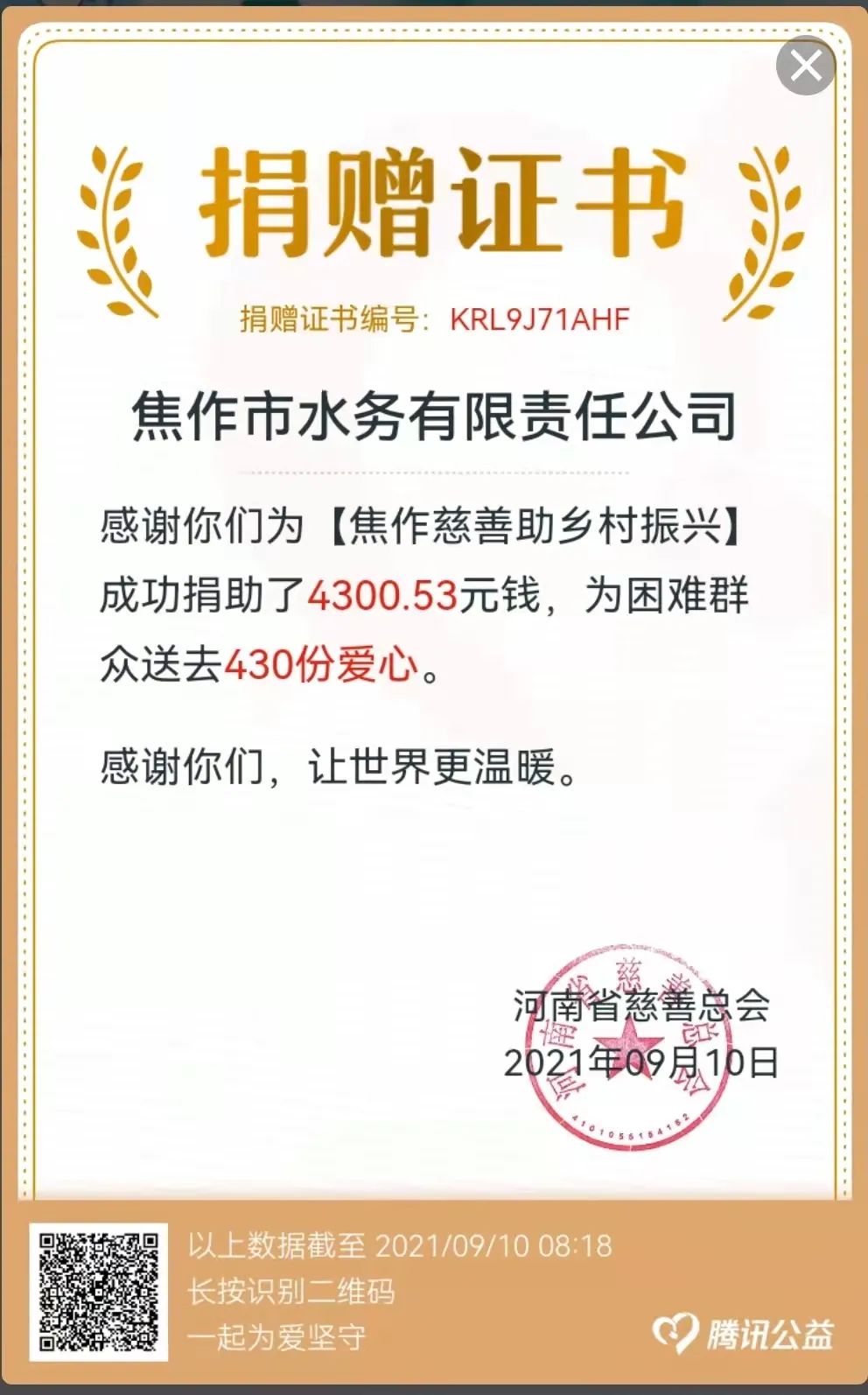 “一方有难,八方支援”是中华民族的优良传统美德,是协作互帮精神的最直接体现。为进一步展现积极向上的团队精神,焦作水务广大员工积极参与“99公益日”网络爱心募捐活动,在9月7日至9日已通过公 ...