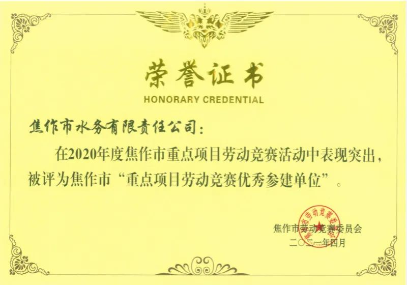 近日,焦作市劳动竞赛委员会对2020年度全市重点项目建设先进集体和先进个人进行通报表彰,焦作水务公司被评为2020年度焦作市重点项目劳动竞赛优秀参建单位荣誉称号,王志彬荣获先进个人称号。■ 近年来,焦作水务 ...