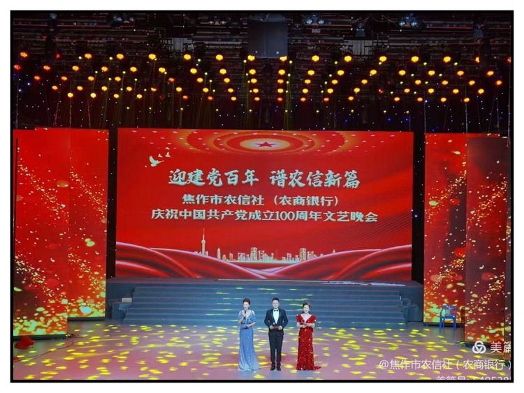 迎建党百年 谱农信新篇” 焦作市农信社(农商银行)庆祝中国共产党成立100周年大型文艺晚会在市广播电视台1号演播厅隆重举行。本次晚会通过微信直播平台同步直播,在线观看万余人,点击量超万人次,社会各界反响良好 ...