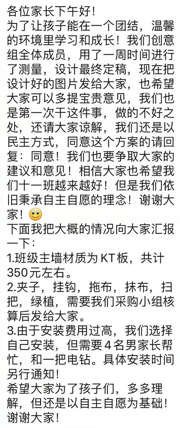 网友您好!热心家长提议创建班级文化的初衷是为了所有孩子,可能因沟通问题给你造成了困扰。您的意见和想法我们很赞同,确实这么做不太得当。现将目前的现状向您告知一下: 1、此次创建班级文化建设的工作在群消息发布后就暂停了此项工作并未向每位家长收费。 2、本次创建班级文化建设是家长朋友们自发自愿的。 3、由于当时的沟通问题给您和其他家长带来了困惑,我们深表歉意。 4、目前学校也正在为全校的每个班级整体布置班级文化。 如果您还有其他的异议欢迎来学校面对面讨论一下 |