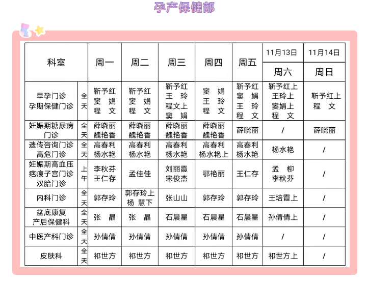 焦作市妇幼保健院2021年11月8日—2021年11月14日门诊出诊信息