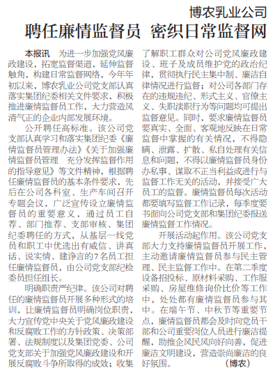点击链接看原版《焦作日报》新闻~~ 为进一步加强公司党风廉政建设工作,拓宽监督渠道,延伸监督触角,构建日常监督网络,加强对小微权力的监督,博农乳业党支部认真落实博农集团纪委相关文件要求,积 ...