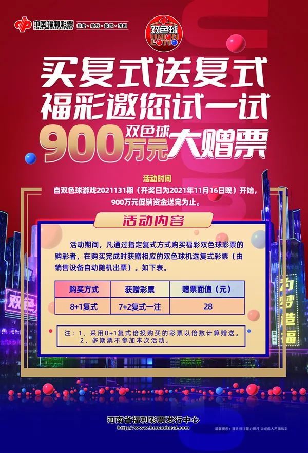 福彩双色球,惊喜送不停。为回馈广大购彩者,2021年11月16日,双色球第2021131期开始,全国范围内开展12亿元大派奖活动,预计派奖20期;同时,河南福彩也将开展配套的双色球900万元大赠票活动,双重惊喜,精彩不断, ...