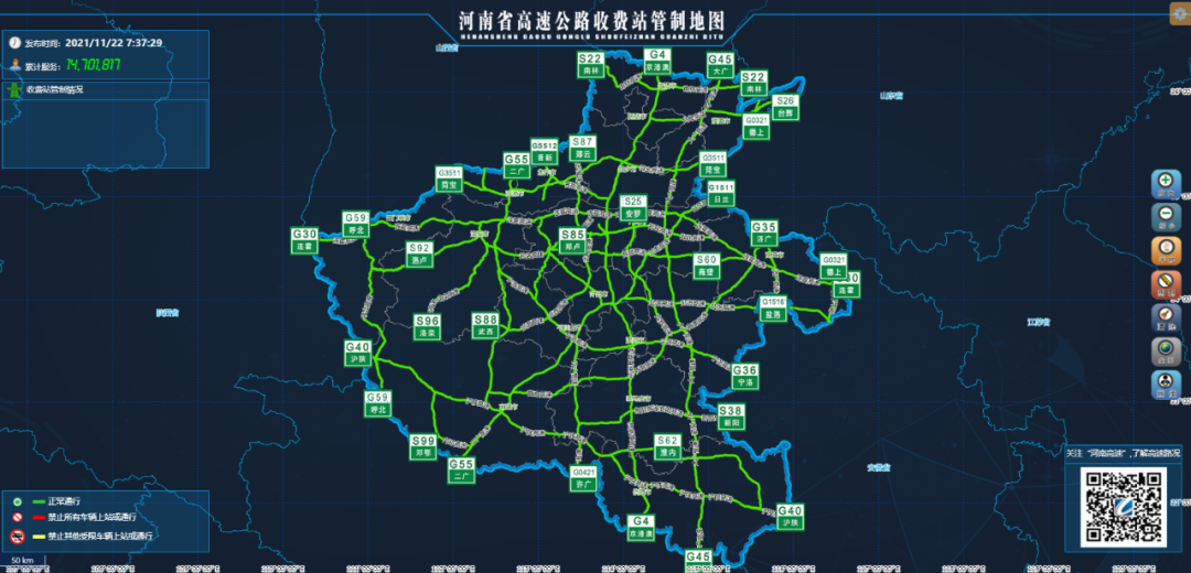 发布时间:2021年11月23日08:45省高速公路路警联合指挥中 省内高速公路通行顺畅。施工路段:1.京港澳高速(G4)确山服务区封闭施工。(施工时间:2020年6月1日-2021年12月31日) 2.京港澳高速(G4)新乡服务区封闭施 ...